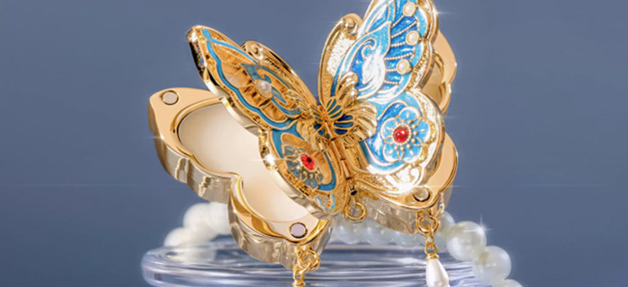 这款香膏的设计灵感源自清代的银烧蓝蝴蝶盒,将古典之美展现得淋漓尽致。蝴蝶造型精致到每一处细节,翅膀上的花纹都是手工上色,点翠珠光,贝母垫片流光溢彩,仿佛一只真正的蝴蝶在掌心翩翩起舞,说是饰品级工艺一点也不为过,精美得如同珍宝一般。而且,翅膀还能自由开合,趣味性拉满!